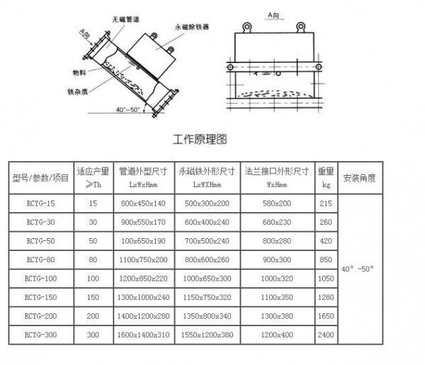 RCYG系列管道式永磁除鐵器是由不銹鋼無(wú)磁管道、懸掛式永磁(電磁)除鐵器、除鐵專(zhuān)用門(mén)組成。該產(chǎn)